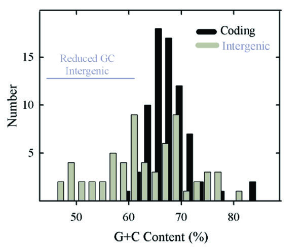 a Intergenic regions with reduced GC content are those with GC contents in the range of 46.3%-61.7%.