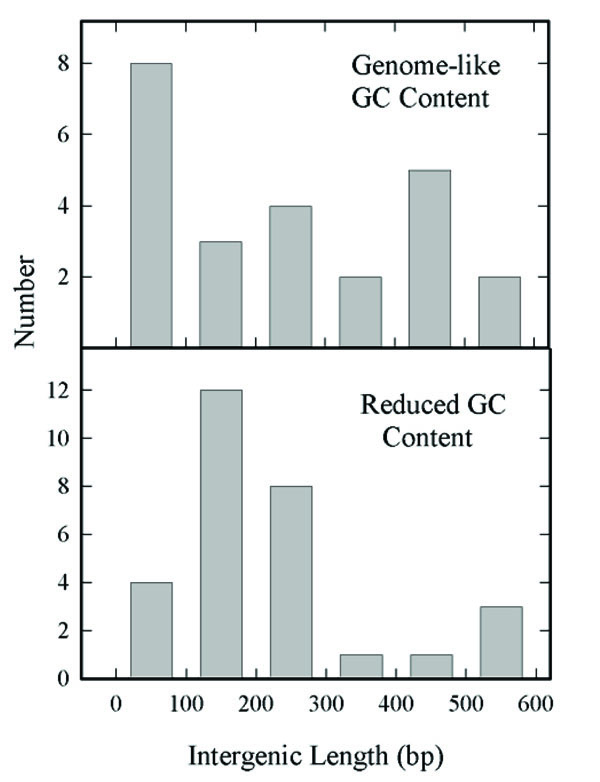 The lengths of intergenic sequences vary from zero (i.e. overlapping genes) to several hundred base pairs (excepting very long intergenic regions that occur near the segment ends). Genome-like and reduced GC intergenic regions differ only slightly in average length, the values being 258.7±195.1 and 230±138.8, respectively. Many reduced GC intergene lengths occur in a single population with a mean of approximately 150 bp, while genome-like lengths are more evenly distributed in the range of 0-600 bp (Fig. 3).