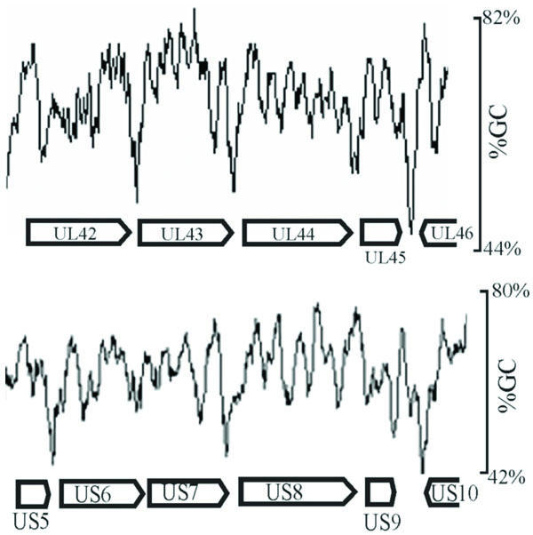 GC content as measured in a sliding 120 bp window shown in representative regions of the HSV-1 genome (between UL42-UL46 and US5-US10). Note the presence of pronounced local minima in GC content in certain intergenic regions such as UL42-UL43 and UL43-UL44, but not in others such as US6-US7.