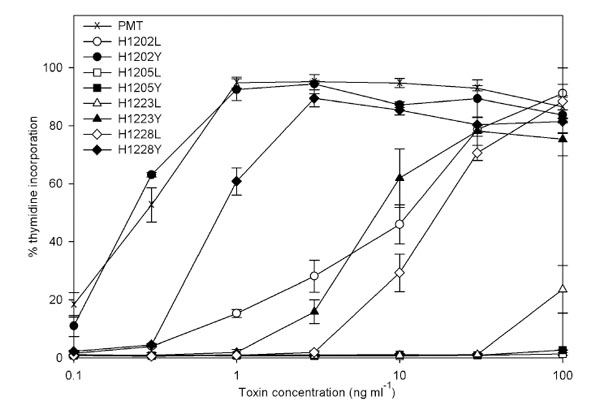 Plasmid DNA was isolated by using Wizard kits (Promega Corporation). For sequence analysis, DNA was further purified by using Qiaquick columns (Qiagen). DNA sequencing was performed with a Beckman CEQ2000 automated DNA sequencer. PMT histidine residues 1202, 1205, 1223 and 1228 were replaced individually with leucine and with tyrosine using the Stratagene Quikchange system. Plasmid pTox2 [16], which encodes the native toxin, was used as the template for site-directed mutagenesis reactions using oligonucleotide primers of 25 nucleotides length designed to generate the desired mutations. Two separate colonies of each of the eight potential mutants were stored for further analysis.