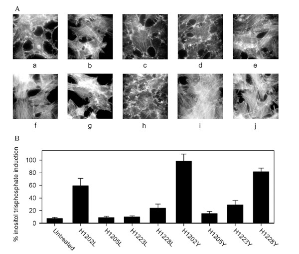 The effect of the amino acid substitutions on the ability to induce cytoskeletal rearrangements was determined. PMT induced the formation of thick, parallel stress fibres, whereas untreated cells contained disorganised actin fibres (Fig. 2A). Only the three histidine mutants that demonstrated the least activity in the thymidine incorporation assay, PMTH1205L, PMTH1205Y and PMTH1223L, failed to induce actin stress fibre formation under these conditions. The effect of the mutations on the activation of Gq was tested by assessing the ability of the mutant toxins to stimulate production of inositol trisphosphate (IP3). PMTH1205L, PMTH1205Y and PMTH1223L did not significantly induce inositol phosphate formation (Fig.2B), showing that they failed to activate Gq. The other mutants were all partially active. These results are summarised in Table 1.