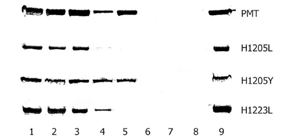 Resistance of PMT and selected histidine mutants to digestion with the protease, Glu-C. One microgram of PMT or mutant toxins was incubated with 25 ng Glu-C (Sigma) in the presence of different concentrations of SDS for 1 h at 37 °C. The SDS concentrations used were: lane 1, no SDS; 2, 0.005 %; 3, 0.075 %; 4, 0.01 %; 5, 0.0125 %; 6, 0.015 %; 7, 0.02 %; 8, 0.025 %. Lane 9 contains toxin with no Glu-C. The products were electrophoresed through 10 % SDS-PAGE gels, and detected by silver staining. The toxin bands of 146 kDa are shown for PMT, PMTH1205L, PMTH1205Y and PMTH1223L