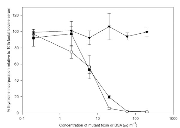 The inactive mutants PMTH1205L and PMTH1205Y were tested for their ability to bind to cells, using the competition assay to assess whether they could block the mitogenic activity of 2 ng PMT ml-1. Each mutant significantly inhibited the mitogenic action of PMT when added to a concentration of 6 μg ml-1 or higher (Fig. 4).