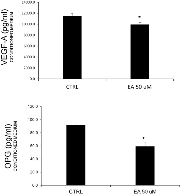 Prostate cancer is known to be associated with bone metastases. Additionally, the involvment of angiogenic factors related to cell proliferation is common. In order to consider these typical features, we measured the VEGF-A and OPG levels in conditioned media obtained after EA treatment (50 μM). The ELISA assay (Fig. 2) showed a decrease of both proteins, confirming the hypothesis about the effect of EA on the release of these factors.