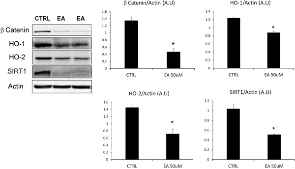 To evaluate the suppression of proliferative and defence capacities of DU145 cells after EA treatment, we assessed the levels of β-catenin, HO-1, HO-2 and SIRT1 (Fig. 3). The densitometric analysis, after normalization with beta-actin, showed that EA treatment, at the concentration previously tested (50 μM), induced a significant reduction of β-catenin and SIRT1 levels. Similarly, we observed a decrease of Heme Oxygenase (HO) protein expression, particularly marked for the constitutive isoform (HO-2).