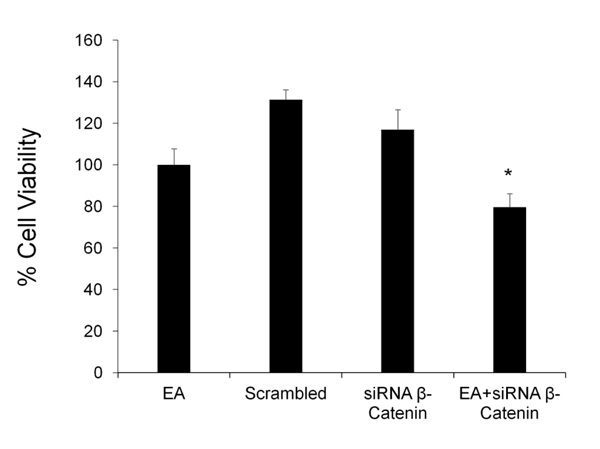 The effect of EA on cell proliferation was tested after silencing β-catenin gene. DU145 cells were treated with EA (50 μM) for 48h in the presence and absence of siRNA against β-catenin; cell viability was detected by MTT assay. Fig. (4) shows that β-catenin siRNA caused a slight decrease in cell viability, while scrambled siRNA did not demonstrate any toxicity. The combination of EA and β-catenin siRNA induced a significant additional reduction of cell viability compared to EA group.