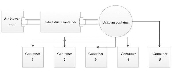 The mice exposure containers with silica dust were 25×15×30 cm3 seamless plastic containers fitted with 3 control valves, through a valve dust was inserted into the container from a uniform one, by another valve, the clean air was fed into the container and another valve was used for sampling and measuring dust inside the container by TSI device. The dust was created by a blower pump inside a container containing silica powder and introduced into a large glass container for first uniformity of dust, and then was guided through the hoses of the connector into the containers. Control valves were used to adjust dust concentration inside the containers. With measuring the amount of silica dust, the valve of the dust concentration in each container was controlled. Finally, the mean concentration during the exposure period was calculated. Fig. (1) shows a schematic representation of the system of the mice exposure to silica dust.