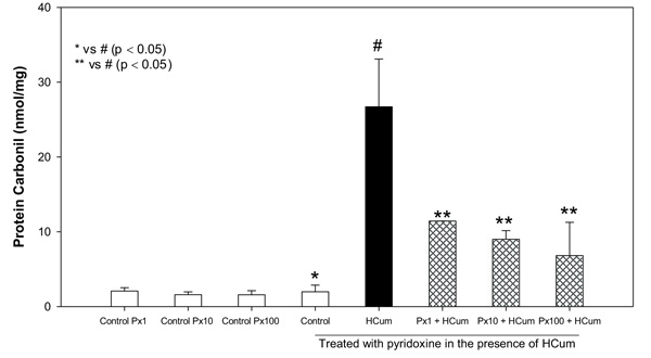 The results indicate that the malondialdehyde concentration decreased with increasing concentration of pyridoxine. The membrane protein content also decreased with increasing concentration of vitamin B6, which was confirmed by the decreased signal intensity in the western blot when compared to control without pyridoxine. Results demonstrate that pyridoxine can significantly decrease lipid peroxidation and protein carbonylation in red cell membrane exposed to high concentrations of oxidant agent.