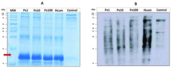 All samples incubated with cumene hydroperoxide had a different electrophoretic profile than the control sample. It was observed that for these samples, there was a notable possible presence of agglomerates of modified globin chains despite the previous process of washing and extracting membrane proteins (Fig. 2a). Cumene hydroperoxide is a very strong oxidant and causes molecular derangements in the hemoglobin chains. In the western blot analysis, a decrease in the oxidation signal intensity for the samples pretreated with pyridoxine was again demonstrated and additionally it was observed that oxidation by carbonylation of proteins was presented specifically for proteins with molecular weight higher than hemoglobin (Fig. 2b).