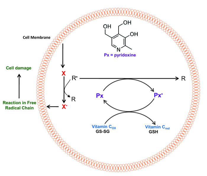 In both in vitro and in vivo studies, evidence of an additional role of pyridoxine has been obtained, acting in favor of the cellular antioxidant system, decreasing the levels of oxidative stress induced by different factors, especially inhibiting the production of superoxide radicals [5, 10] singlet oxygen [11] and lipid peroxidation levels [10, 40]. However, the mechanism is still not well understood.