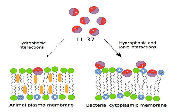 Most antimicrobial effects directly from cathelicidin can be related to its physical structure and cationic and hydrophobic properties [39]. N-terminal helix plays a role in chemotaxis and defense against proteolisis, while C-terminal helix is responsible for antimicrobial effect. Cathelicidin goes toward microbial membrane, then covers the surface for the microbial membrane, and perforates it, forming pores on the membrane which eventually destroys bacterium. Cathelicidin basically binds cell membrane which contains lipopolysaccharide (Gram-negative) or teichoic acid (Gram-positive) with negative charge, unlike zwitterionic eukariotic membrane. Cathelicidin also has antiviral capability with interaction between capsule membrane and protein capsid.