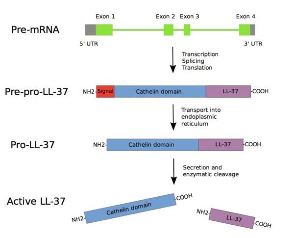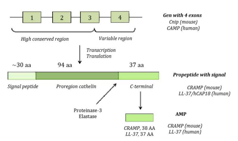 CAMP gene consists of four exons. The first three exons encode signal peptide and pro cathelin section, while the fourth exon encodes a processing site and peptide. After the transcription and translation process, pre-pro-LL-37 is delivered to endoplasmic reticulum, while signal peptide is split during the process. Depending on the type and condition of the cell, pro-LL-37 is then transported further and stored in granules or is immediately secreted. The secreted Pro-LL-37 is then transformed into LL-37 by proteinase 3 enzyme produced azurophil neutrophilic granules [22] (Fig. 4).