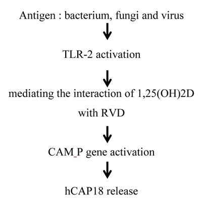 Vitamin D mediates the synthesis of cathelicidin through the expression of Vitamin D Receptor (VDR). Microbial molecules, such as lipoteikoic acid, peptidoglycan, and atypical lipopolysaccharide from Leptospira and Porphyromona gingivalis specie, lipomanan from mycobacterial family, a number of viral and fungal antigens, activate toll-like receptors 2 (TLR-2), then the receptor will trigger a response mediated by vitamin D in the form of interaction between 1,25(OH)2D and VDR. This interaction will activate the CAMP gene to express cathelicidin. The increase or reduction of VDR expression will change cathelicidin level. In the presence of stimulus by infection, vitamin D level also increases the TLR-2 expression, enabling increased response to TLR activation. Some gene polymorphisms which encode TLR-2 or VDR play a role in serious sepsis caused by Gram positive bacterium or infection by mycobacterium. This evidence sets vitamin D as the most important factor in cathelicidin regulation and may explain the antimicrobial work connected with vitamin D [23]. Schematically, cathelicidin synthesis is shown in Fig. (5).