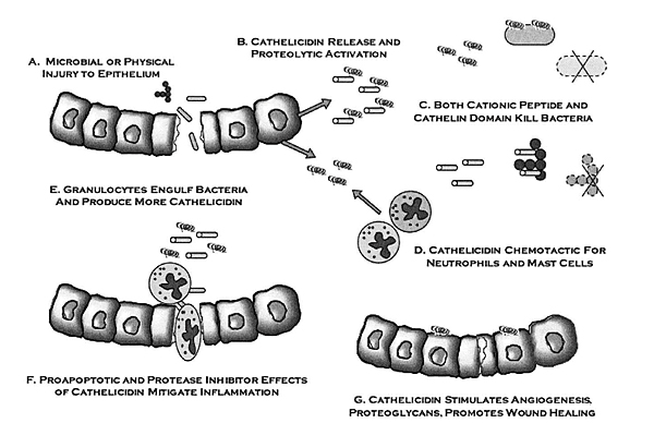 Cathelicidin has additional effects which may vary depending on local concentration [45]. It has been proven in vitro, for example, that at a dosage less than 1 mol, Cathelicidin helps inducing neutrophil chemotaxis and survival of neutrophil, and stimulating angiogenesis and fibroblast migration and proliferation (useful effects in healing wounds), while very high concentration, usually outside of the one achieved in normal response, has cytotoxic and pro-inflammatory effects [45].