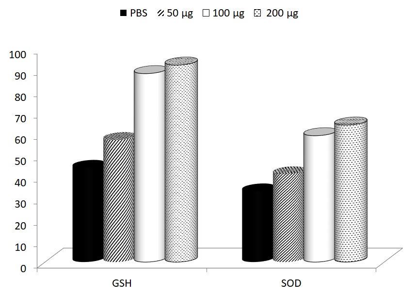 Glucans are known to significantly affect various facets of the immune response. To find out the possible effects of glucan supplementation in our model, the changes in phagocytic activity were tested. Data summarized in Fig. (3) showed that all three doses of glucan significantly improved the suppressed phagocytic activity of peripheral blood neutrophils (control values were 30.3 ± 1.4).