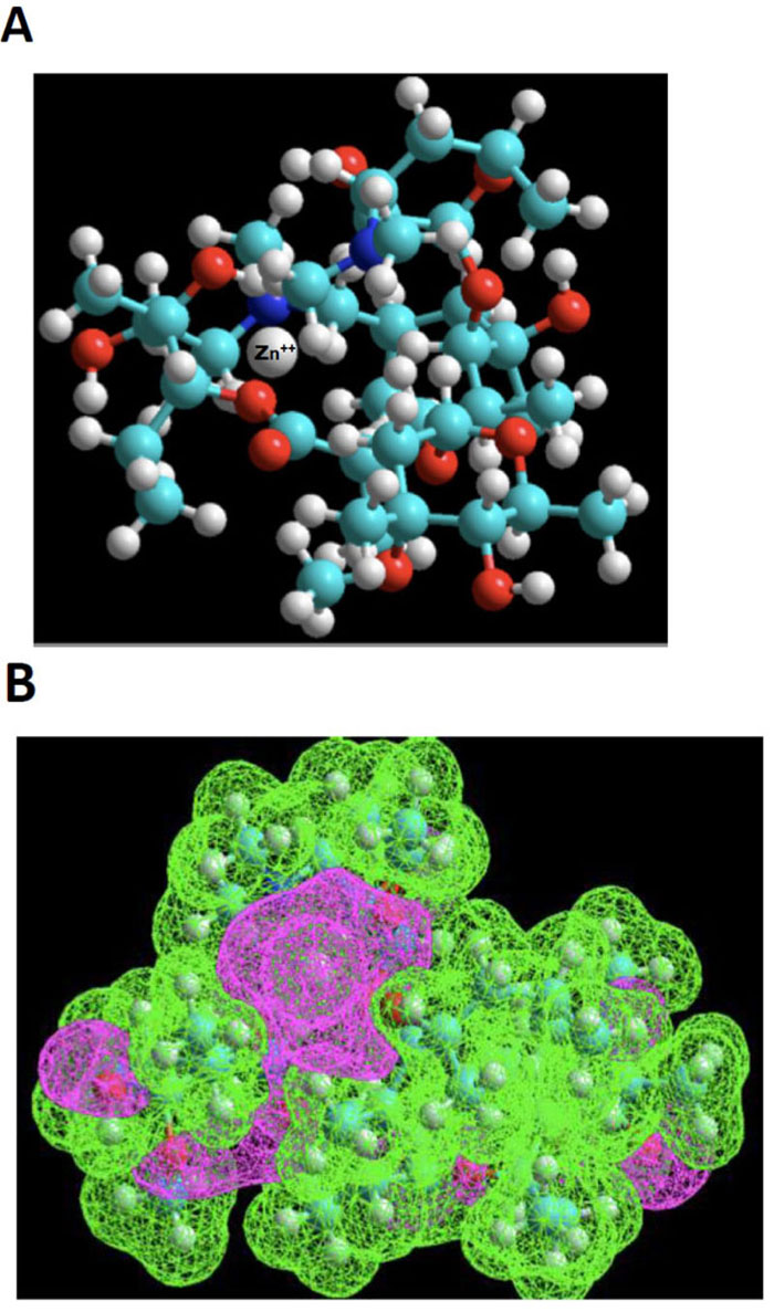 Based on the above premise, it is therefore not surprising that our “landing” exploration attempts were initially met with poor success. However, using the “transition state” tool, we were able to observe the dynamic behavior of Zn++ in its exploration of a large topological territory, which reflects its intrinsic affinity. Even in a volume of space very electron-rich, for instance, in the neighborhood of the two ose side-chains, this exploration was highly time-consuming. The reason for this can be found in the narrow access to the gate between the pincer mouth of the twin sugar-like moieties. The successful candidate exhibits a strong clastic binding with a hydroxyl group and the N-dimethylamino moiety, as shown in Fig. (2B), estimated by thermodynamic cycling in the order of 30 kcal/mol.