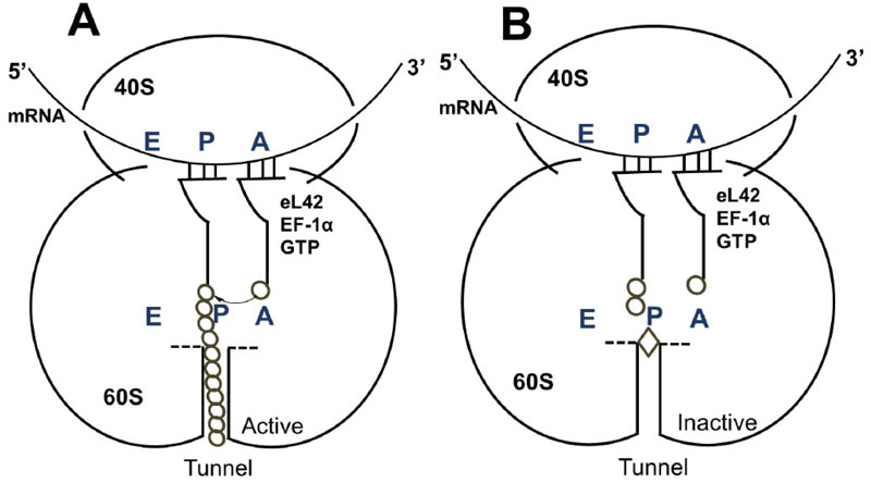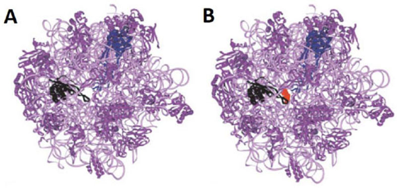 Fig. (4). Schematic of the binding site of azithromycin on the human 80S ribosomes. (A) In the absence or (B) in the presence of azithromycin.