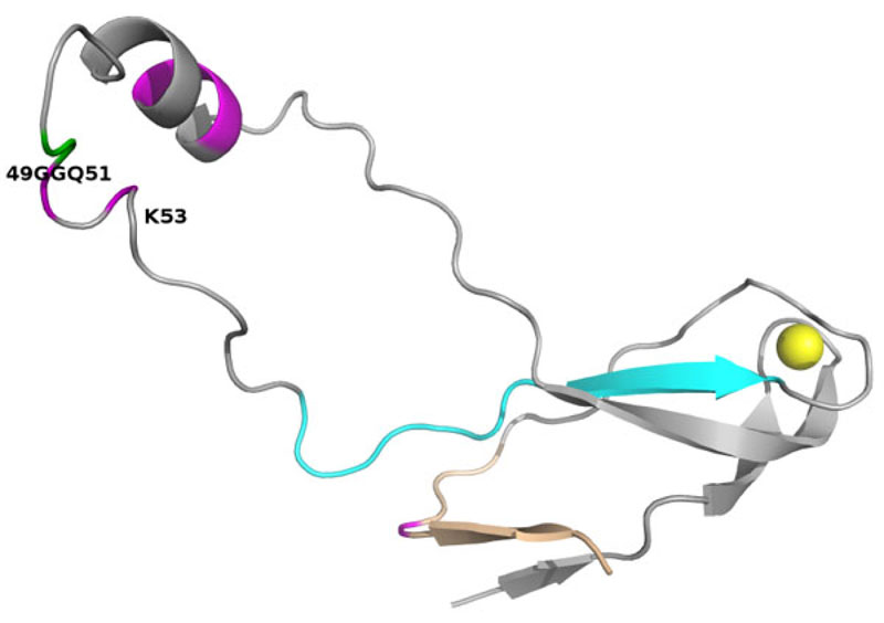 Fig. (5). Model of the human eL42 protein. Ribbon representation of the 3-D structure of human rp eL42 (formerly RPL36AL) (fragment 1-94) modeled by homology with the crystallographic structure of the archaeal counterpart rp eL42 (formerly RPL44E) of the 50S ribosomal subunit from Haloarcula marismortui [28, 29]. The post-translational modifications (including the methylated Q51), and the consensus pattern 61Kx(TorV)KKxxL(KorR)xxC72 (numbering of human eL42) of the eL42 family of r-proteins are colored pink and cyan, respectively. The 49GG50 dipeptide of the GGQ motif is highlighted in green. A zinc ion represented by a cadmium colored yellow is also shown. Fragment 86-94 corresponding to the nucleotide binding motif 2 (NBD2) is shown in wheat.
