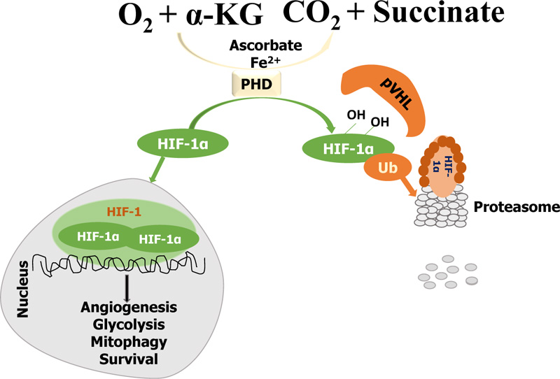 Regulation of HIF occurs through two oxygen-dependent mechanisms: PHD represents one part of the regulation of HIF, and FIH represents the other. Essentially, the enzymes of the families of both PHD and FIH utilize ascorbate, a-ketoglutarate (alpha-KG), and O2 as their substrates, whereas their catalytic center consists of Fe2+ [48]. The role of PHD is to bind specific residues of HIF-1alpha or HIF-2alpha subunits and cause ubiquitination, leading to the degradation of HIF in the proteasome and, as a result, preventing HIF from being involved in gene transcription. On the other hand, FIH prevents the activation of HIF by blocking the co-activators of HIF. At low oxygen levels, oxygen serves as a limiting substrate for both FIH and PHD; when the oxygen levels are normal, PHD and FIH are active but inactive when the oxygen levels are low [2, 25].