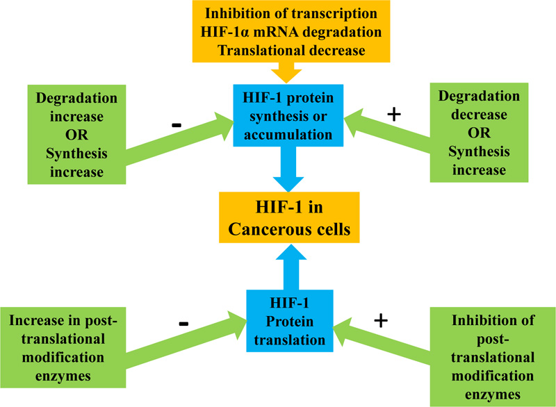 Agents that affect the synthesis of HIF-1 protein include inhibitors of cyclin-dependent kinase, topoisomerase I and II, tumor formation pathway, thioredoxin reductase, and tyrosine kinase. The activation of HIF-1 is highly dependent on the synthesis and HIF-1 protein availability. Therefore, to deactivate HIF-1, some compounds act by inhibiting or decreasing its protein synthesis [71] and regulating the rate of synthesis and degradation to control HIF-1alpha protein accumulation. A decrease in protein synthesis or an increase in its degradation prevents HIF-1alpha protein accumulation, while a decrease in degradation or an increase in synthesis can induce HIF-1alpha protein (Fig. 4). The major mechanisms of decreasing HIF-1alpha protein synthesis are HIF-1alpha mRNA degradation and translational decrease [71]. HIF-1alpha protein synthesis is inhibited by microtubule disrupting agents (MDA) by preventing the activation of HIF-1 and accumulation of HIF-1alpha protein. Masoud, G. N. and Li, W [65]. describe an RNA module consisting of synthetic oligonucleotide antisense that specifically binds and inhibits HIF-1alpha mRNA expression [65]. HIF-1 alpha mRNA has been downregulated in doses dependent upon binding to EZN-2968, resulting in both normoxia and hypoxia inhibition [72]. The EZN-2968 therapy showed tumor reduction in mice implanted with DU-145 human prostate cancer cells. The evaluation in 4 out of 6 patients with paired biopsies of the patient's EZN-2968 therapy showed that HIF-1alpha mRNA was decreased in post-treatment biopsies, while y, 2 patients had reduced mRNA level, and in target gene protein HIF-1alpha [72]. This supports the pilot evidence that, in response to EZN-2968, HIF-1alpha mRNA has the potential for inhibition as a cancer therapy target [65].