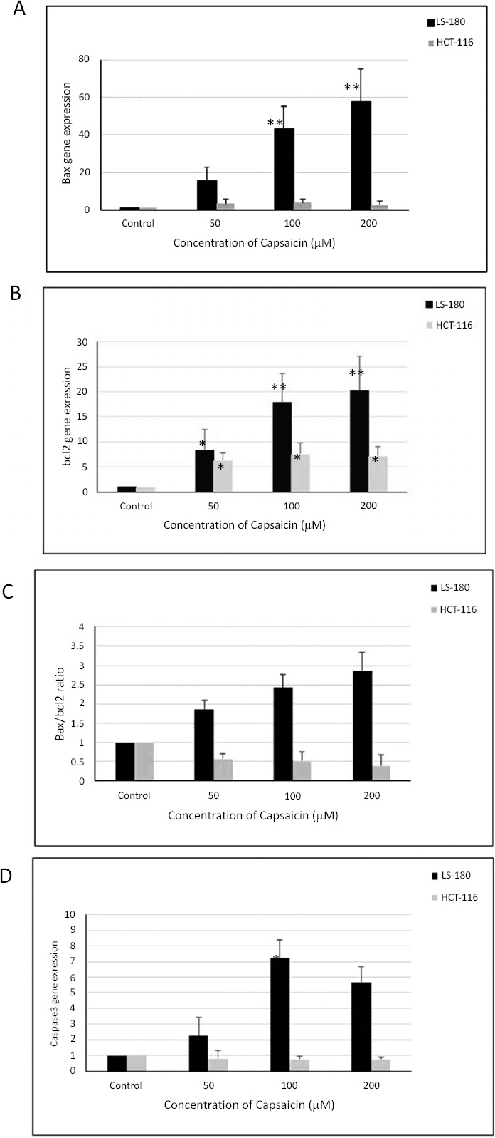 The results of this study showed that the expression level of the Bax gene increased in all doses of capsaicin-treated cells in the two examined cell lines. However, this increase was statistically significant only in the LS-180 cell line (Fig. 1A).