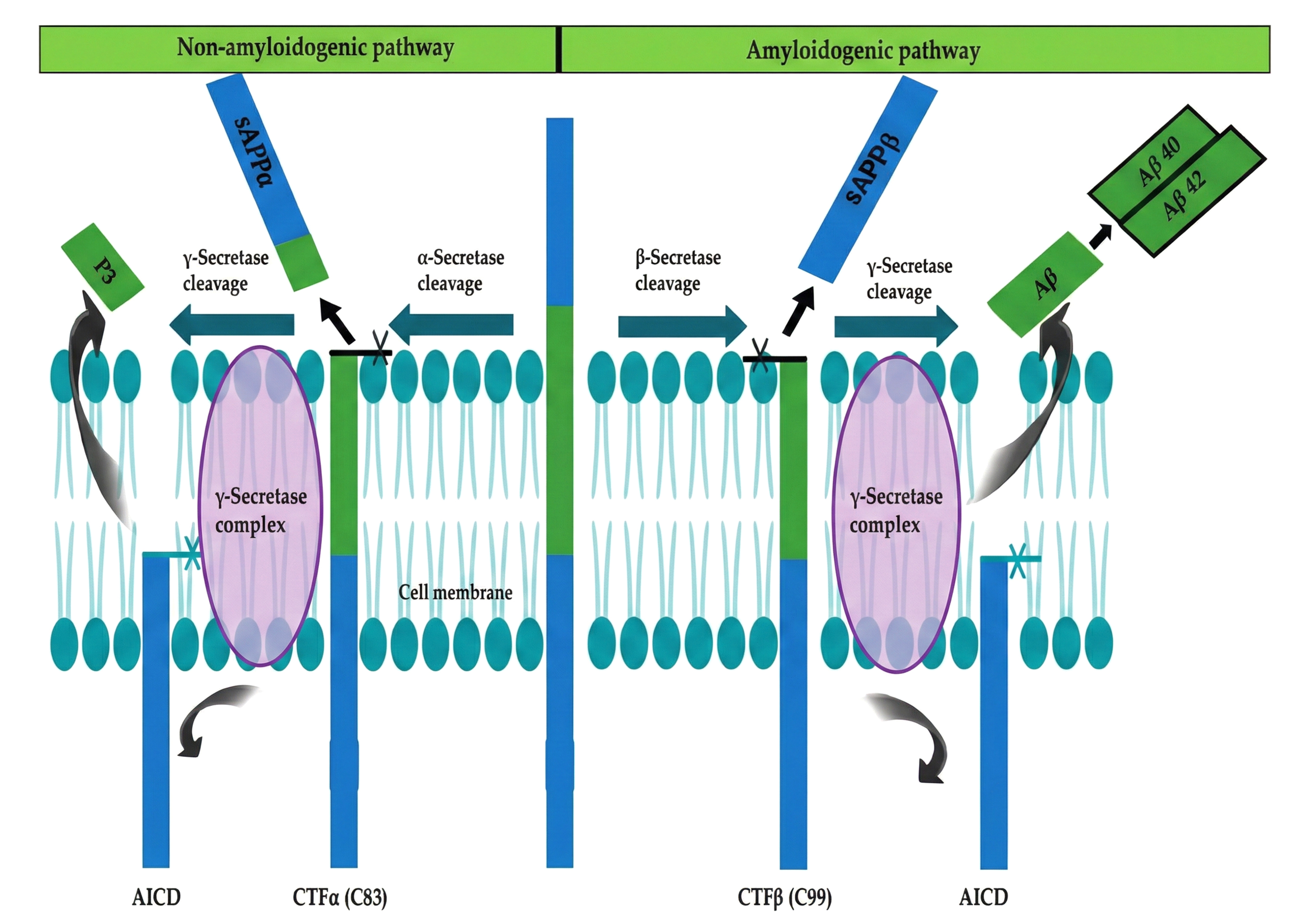 Dual pathways of APP cleavage (non-amyloidogenic and amyloidogenic). This figure, adapted from [24], shows how the APP is processed by proteases at the cell membrane through both amyloidogenic and non-amyloidogenic pathways. APP is broken down by α-secretase at the extracellular domain in the non-amyloidogenic pathway, producing sAPPα and the membrane-bound CTFα (C83), which is then processed by γ-secretase inside the lipid bilayer to yield the P3 peptide and the AICD. AICD and Aβ peptides, particularly Aβ40 and Aβ42, are released when γ-secretase cleaves APP at a similar extracellular site in the amyloidogenic pathway, resulting in sAPPβ and CTFβ (C99). These occurrences highlight the membrane localization of APP metabolism [14, 19, 24].