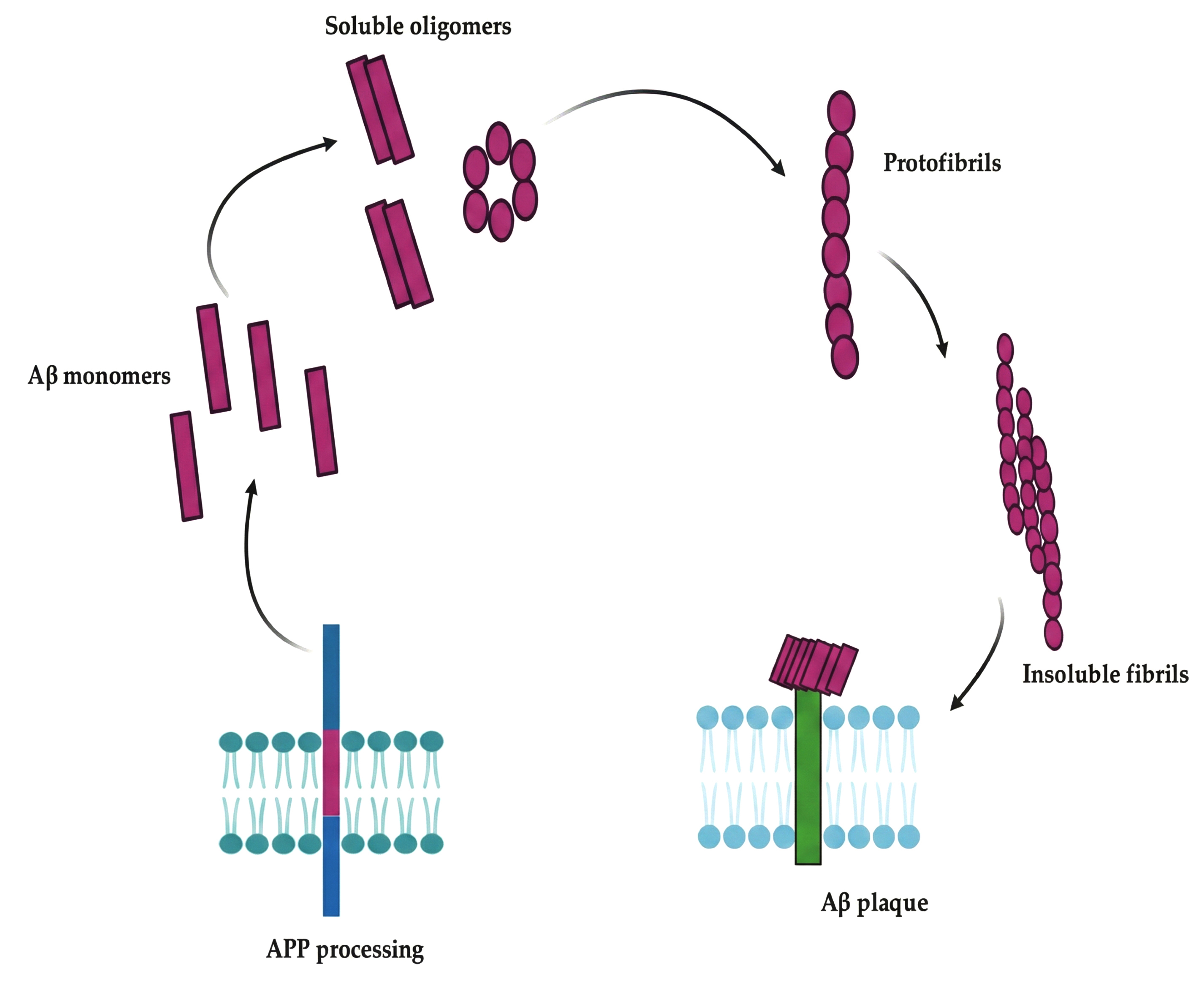 The aggregation and fibril formation of Aβ peptides. This figure, adapted from [28], depicts the sequential aggregation of Aβ peptides following APP processing. In the extracellular space, Aβ monomers are first produced and released, where they self-assemble into soluble oligomers. After interacting with the neuronal cell surface, these oligomers further assemble into linear protofibrils. Aβ plaques are formed when these protofibrils lengthen and solidify into insoluble fibrils that eventually accumulate close to neuronal membranes. AD pathology is significantly influenced by the accumulation of these aggregates at the cell surface, which may compromise membrane integrity and cellular function [26, 28].