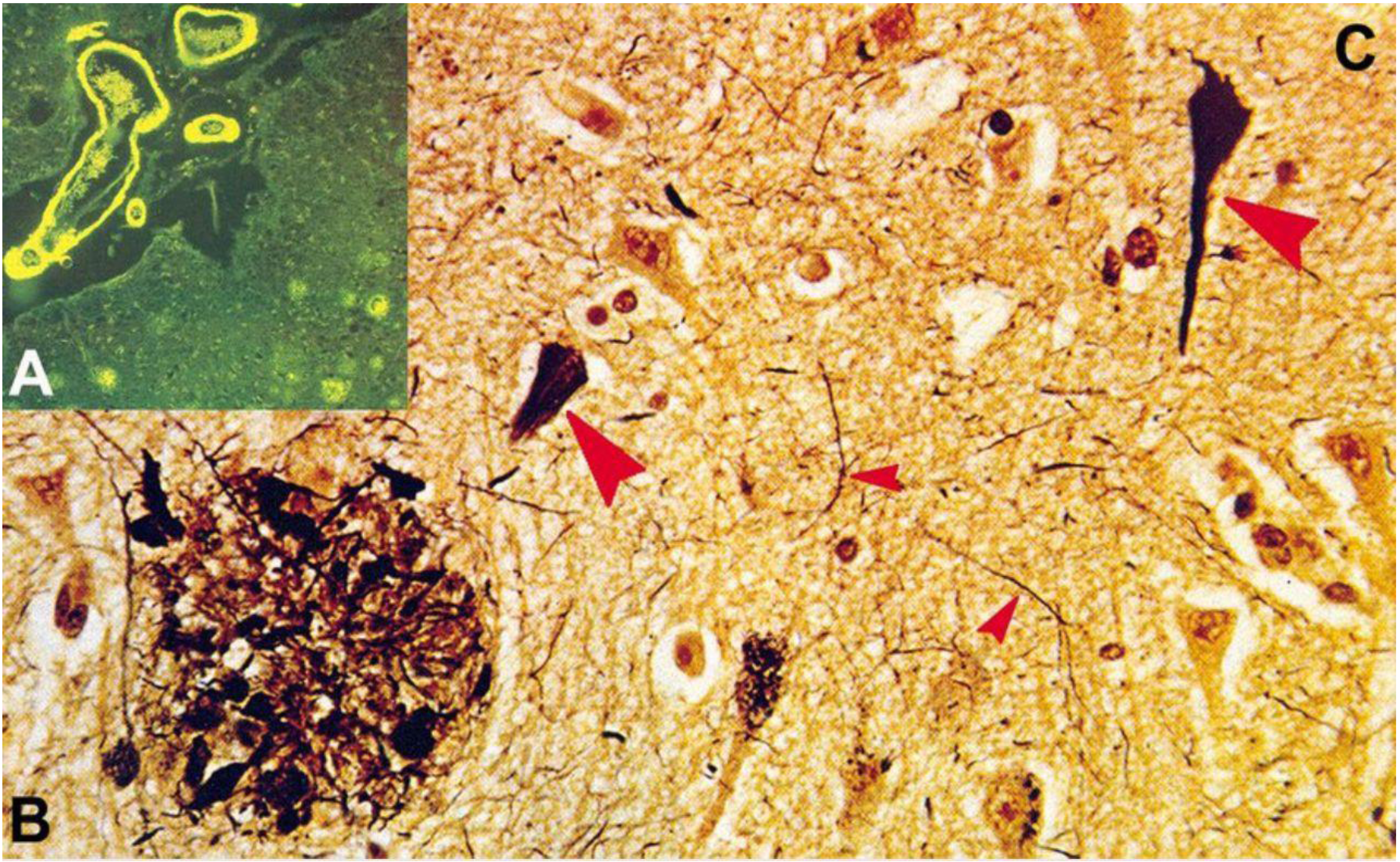 Histopathological images depicting the pathogenesis of AD. This figure, adapted from [47], illustrates the histopathological changes characteristic of AD, including: (A) Congo red-stained amyloid plaques in the neuropil, which are used to identify amyloid deposits [46]; (B) Neuritic plaque with dystrophic neurites revealed by Bodian stain, which accentuates neuronal processes and structural abnormalities [47]; and (C) neurofibrillary tangles (big arrows) and neuropil threads (small arrows), which are also shown by Bodian stain, indicating the presence of pathological filamentous tau aggregates within neurons [46, 47].