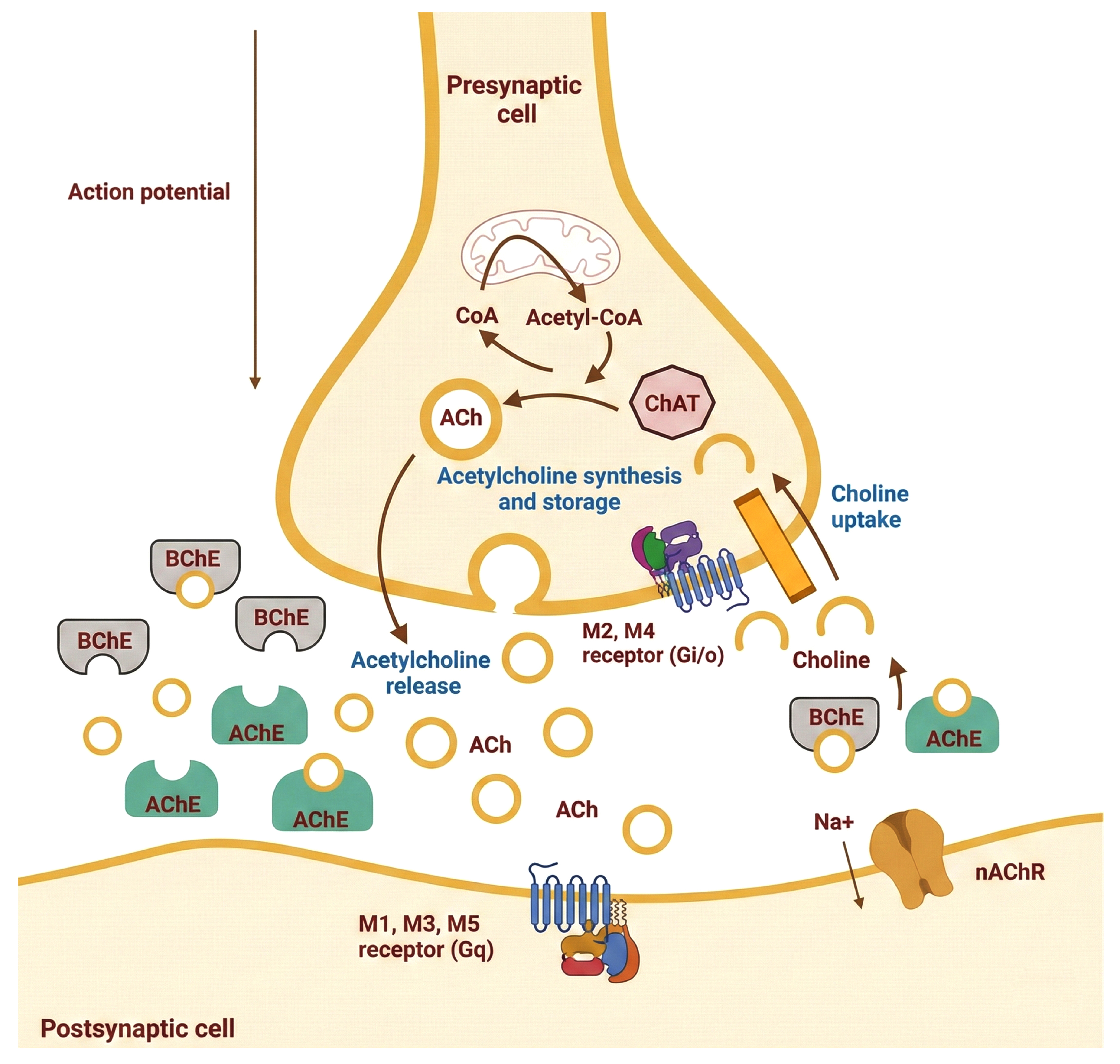 A neurotransmitter called acetylcholine (ACh), released by cholinergic neurons, plays a central role in signal transduction mechanisms related to memory and learning. The cholinergic theory the earliest proposed explanation for Alzheimer’s disease (AD) pathophysiology arose from observations that cholinergic neurons are involved in cognitive decline and behavioral impairments associated with AD. Abnormalities in central cholinergic function can contribute to apoptosis, neuroinflammation, aberrant tau phosphorylation, and other pathological processes [48].
