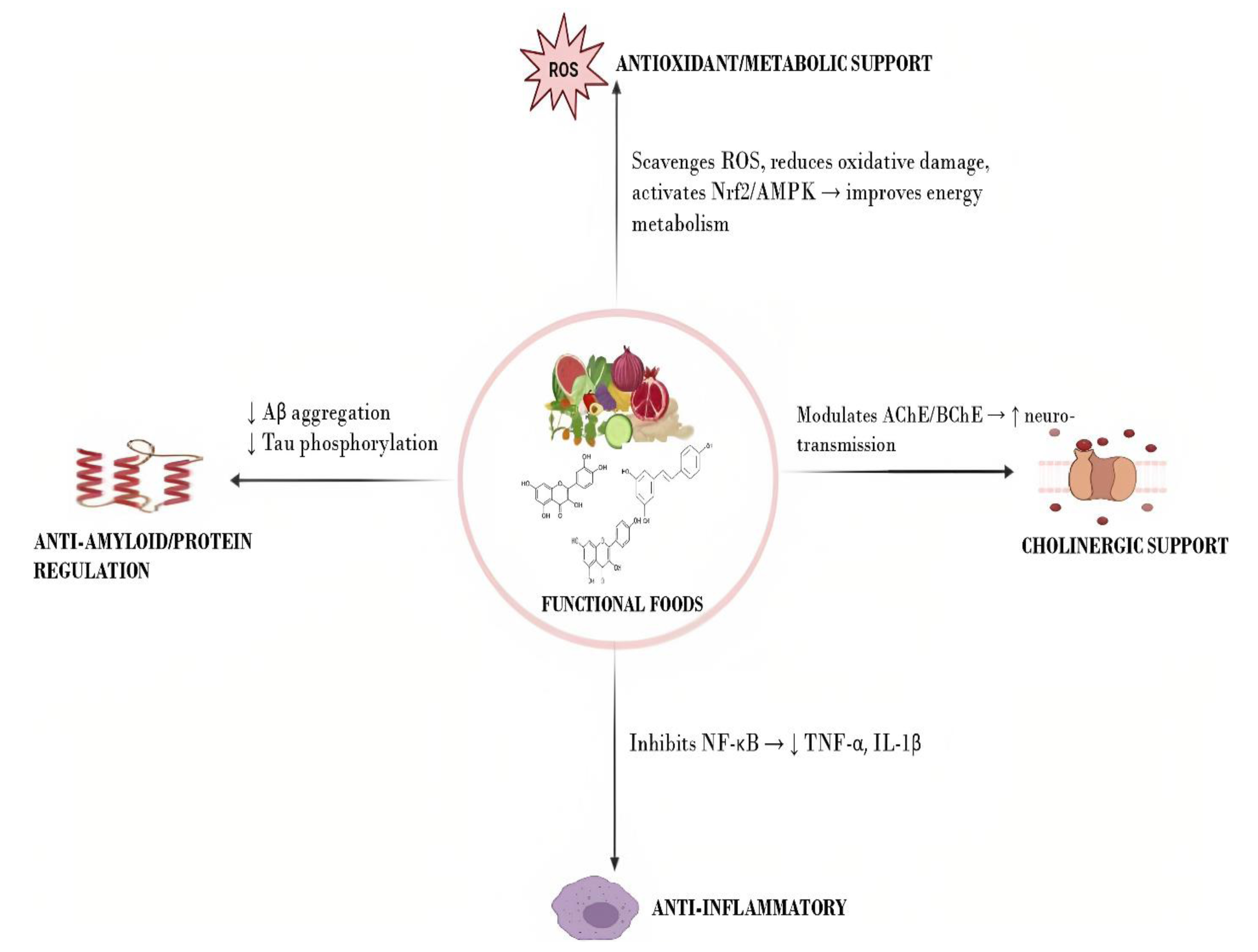 Although oxidative stress and neuroinflammation in AD have been covered in great detail in earlier reviews, these mechanisms are frequently addressed independently or primarily focus on synthetic pharmacological interventions. Furthermore, despite the growing awareness of the oxido-inflammatory balance, there is still a lack of comprehensive research on how functional foods can concurrently alter oxidative and inflammatory pathways, providing a multitarget and safer substitute. With a focus on functional food-based interventions that target the oxidative-inflammatory balance as a promising avenue for managing AD, this review highlights the biochemical mechanisms by which functional foods exert neuroprotective effects in AD, while also summarizing the key preclinical findings and existing clinical trial results to provide an integrative synopsis of their translational potential.